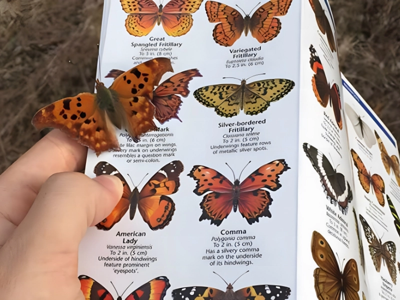 A striking Question Mark butterfly lands on an open reference showing its species, as if recognizing itself.
