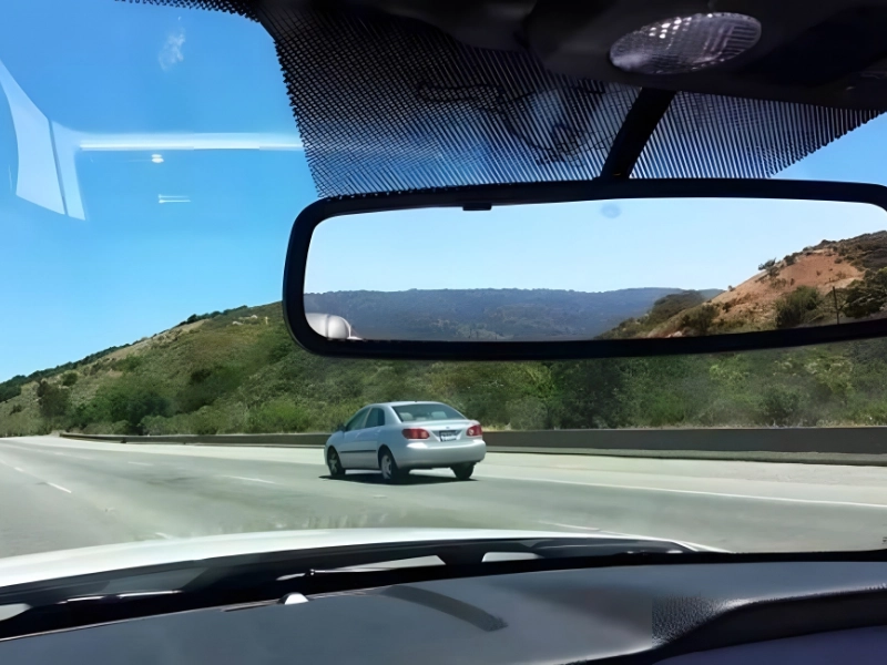 The driver noticed the mirror’s scene blended perfectly into the windshield view ahead while cruising.